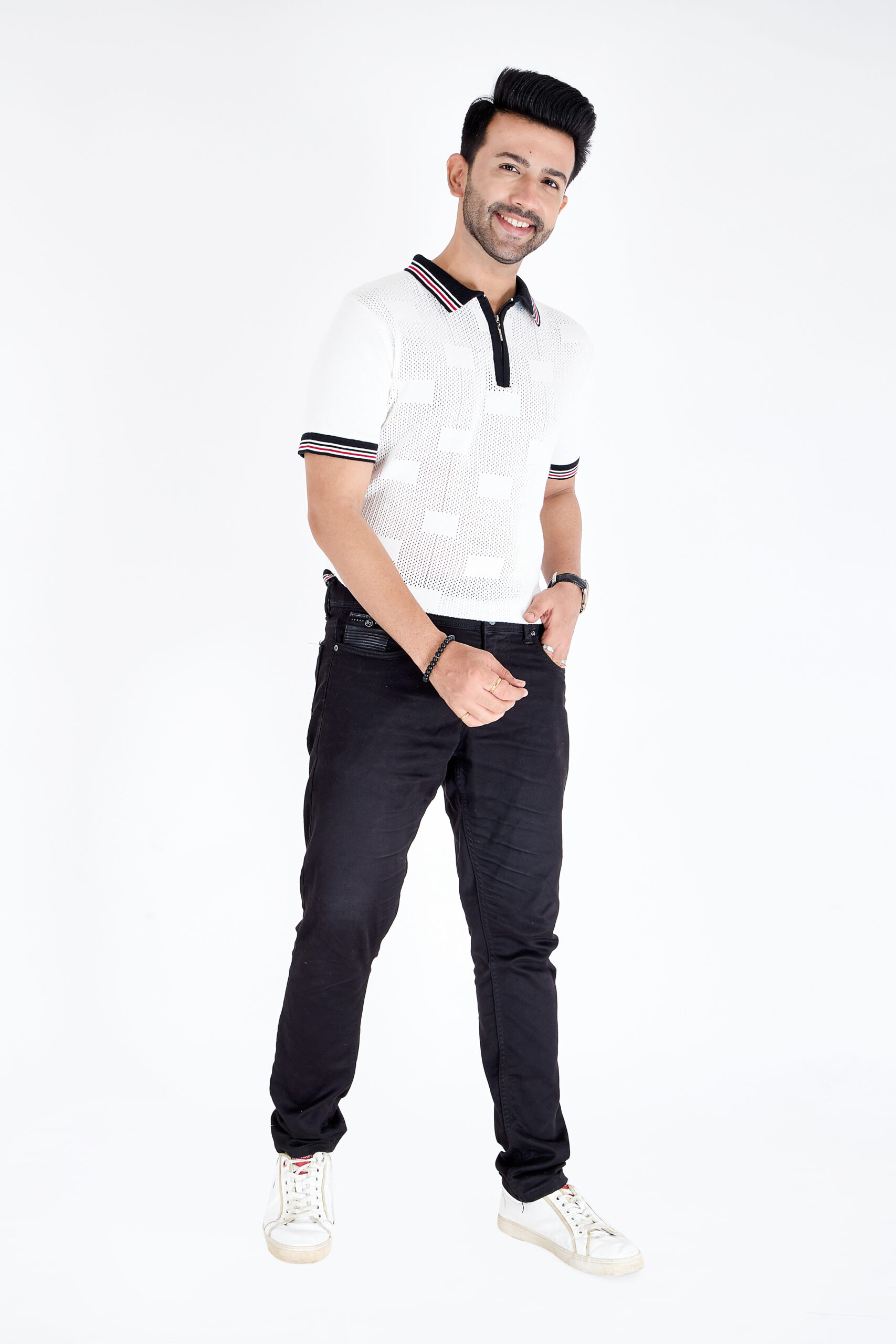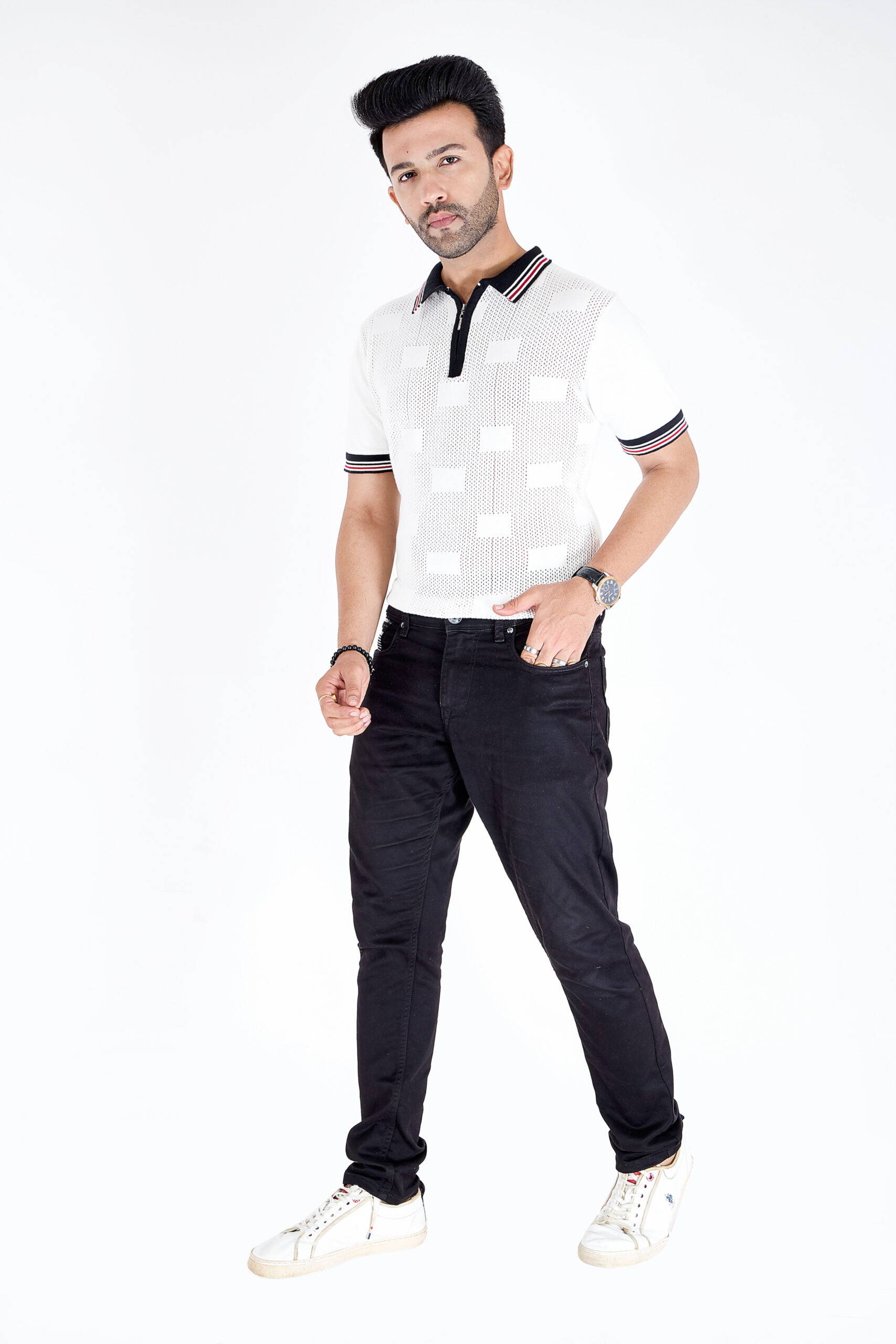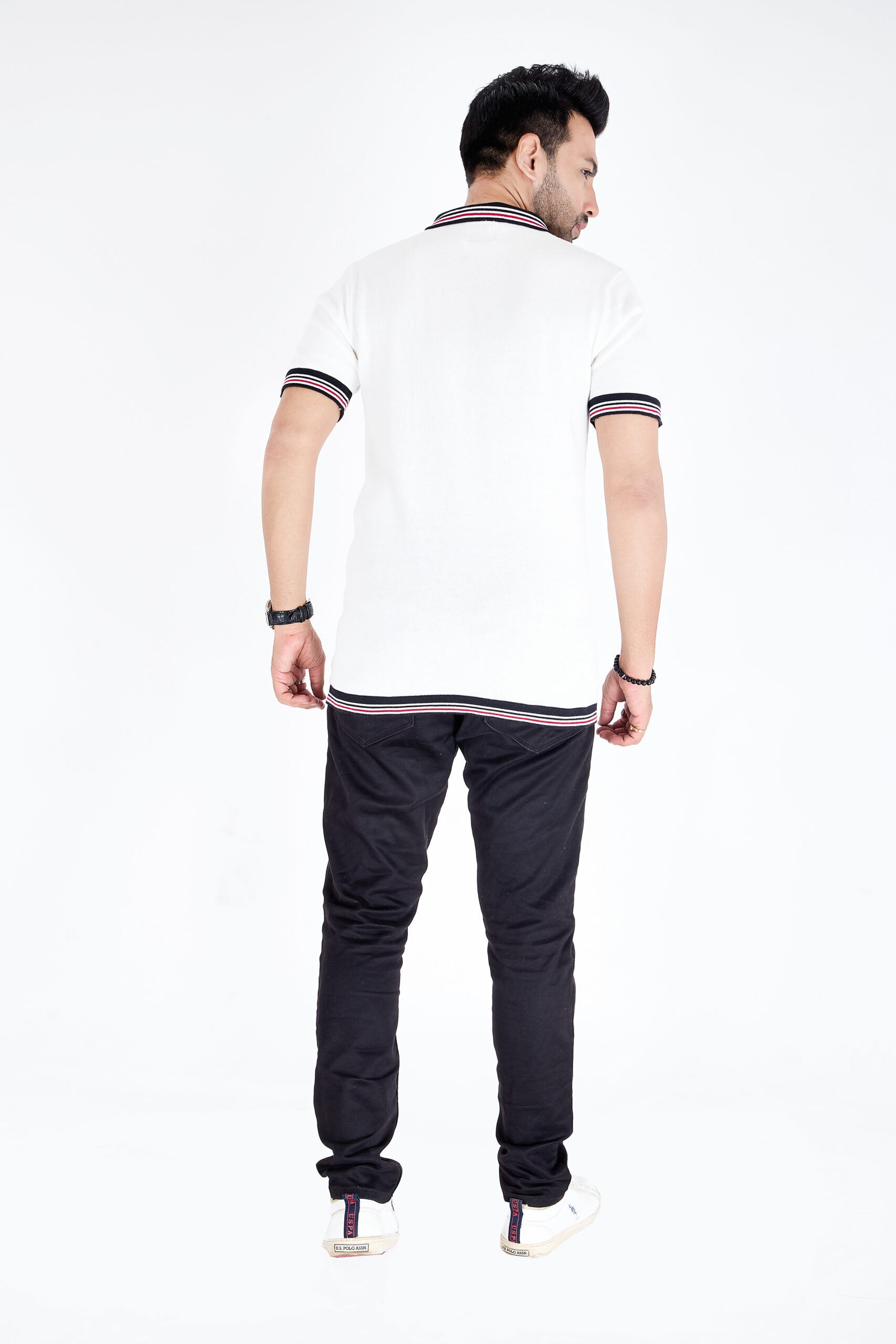 Style: Modern Zip-Collar Polo with Contrast Trim.